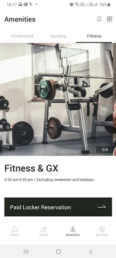 The nursing and Fitness room is to provide health management services under one roof to the tenant employees and visitors. A personal locker is also included as a part of the management. Fitness is a paid facility that prevents unauthorized use of the facility and ensures that a pleasant and safe environment is maintained.
