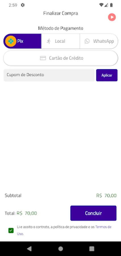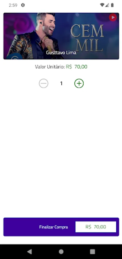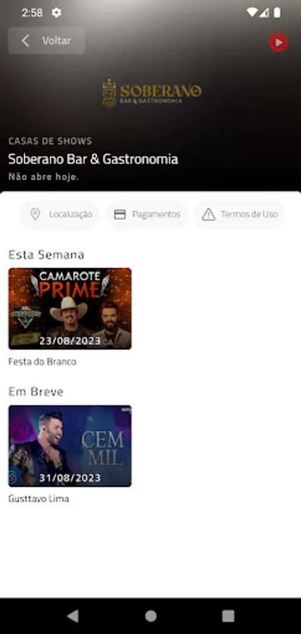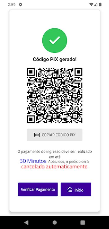 The events are divided by region and categories, such as parties, ballads, festivals and many others. When choosing your event, your tickets will be stored in purchases to make the payment, and after paying, your QR code will be generated to enter the event.