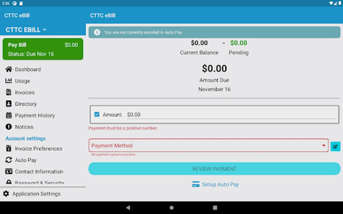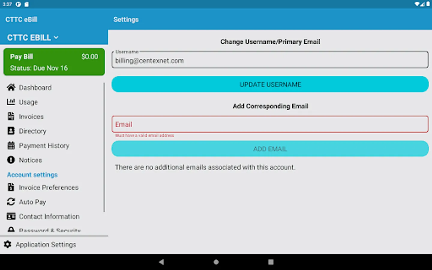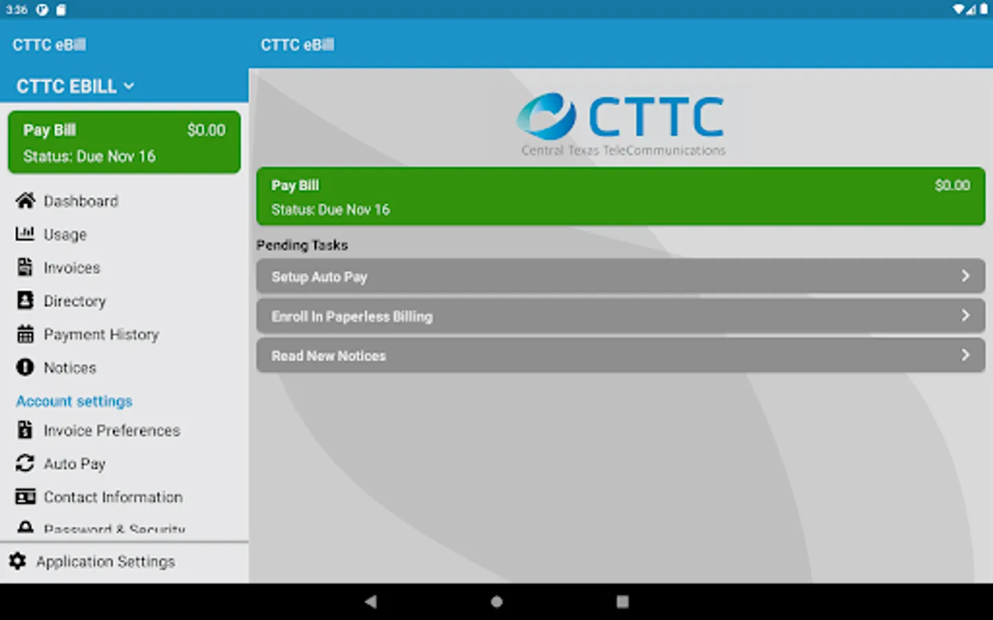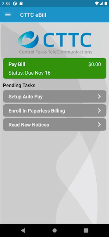 CTTC's eBill mobile app provides access to your Central Texas eBill account allowing you to make payments, view usage, and review invoices right on your mobile device. Forget the hassle of in-store payments and set up autopayments for safe, easy payments to your account. Log in using your existing CTTC eBill online username and password or, if you are a new user or don't have an account, simply use your latest invoice to register and set up your eBill account. For additional help concerning your eBill account, contact our customer service representatives during office hours. Download the CTTC eBill mobile app today for faster, secure access to your billing account.