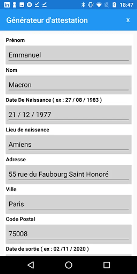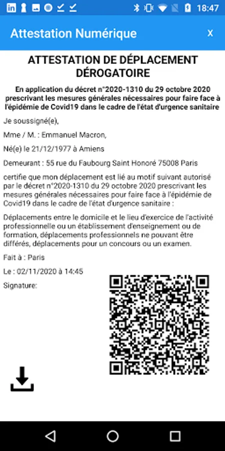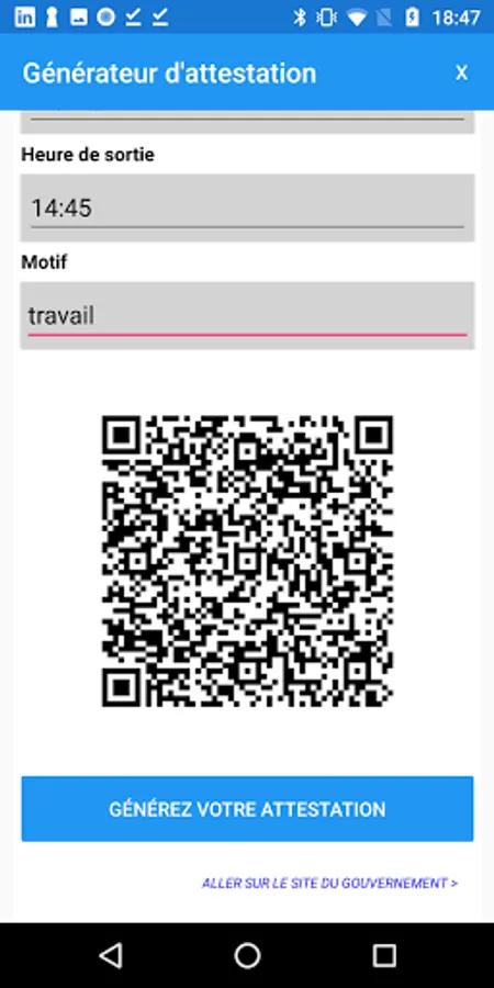 Tired of entering your information to generate your exceptional travel certificates? The application will save your information on your smartphone to generate your digital certificates in two clicks without going through the government site! The QR code is generated directly by your phone, without sending any of your information over the internet.