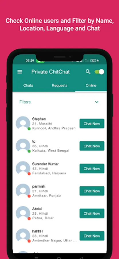 Create your profile, add photos and go browsing thousands of online users in your city. You can see users who belong to your age group and city. If you like anyone, simply just express interest by sending a message. If they like you too, you can start a conversation on Private Chat with each other and set up your date offline.