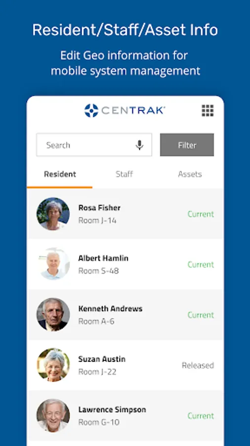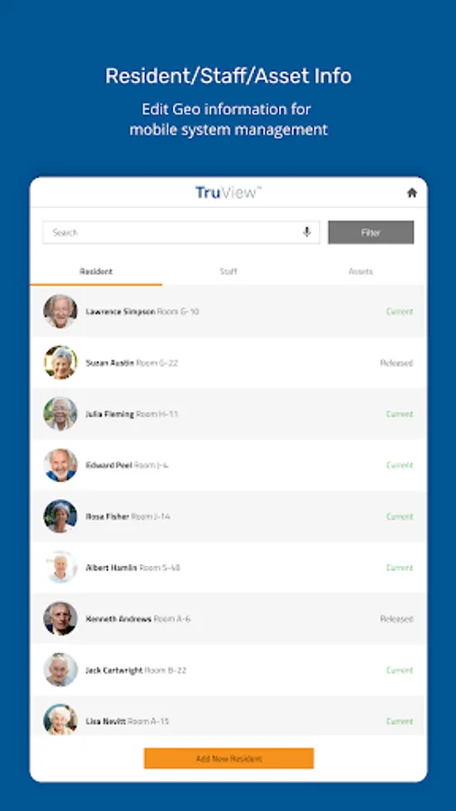 2) Resident/Staff Information - to provide resident/staff/asset information in a tabular format as well as ability to assign/change residents/staff Geo Pendants