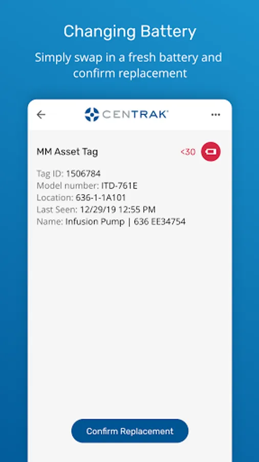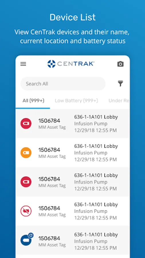 The app allows CenTrak customers to view which devices require a battery change, which devices are under a battery replacement review, and which, if any, battery replacements failed.