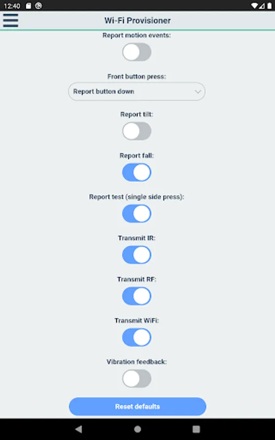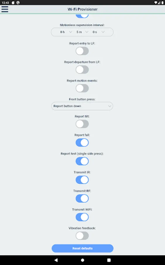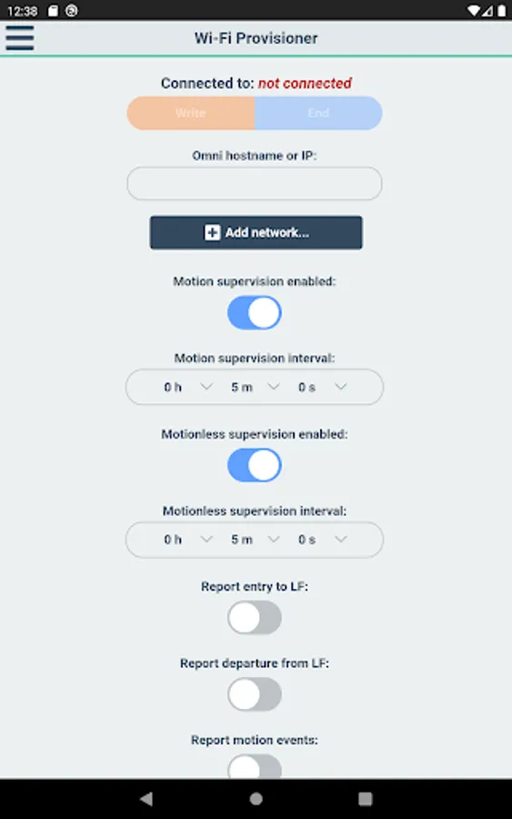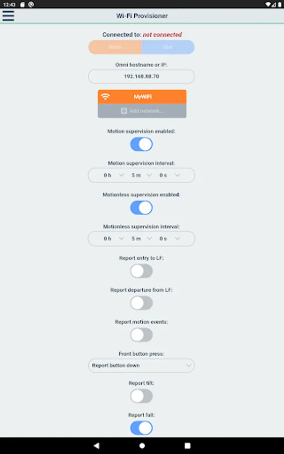 The utility is used to configure Centrak Elpas Man Down Wi-Fi Tags. It awaits the tag to connect to the handset device configured as a hot spot with name 'TagSetup' and password '11223344' by pressing any of the tag side buttons for 10 seconds. By pressing the 'Write' button, once the tag has been connected, the new tag configuration will be transferred. By just repeating the procedure, the user can configure many wi-fi tags in no time.