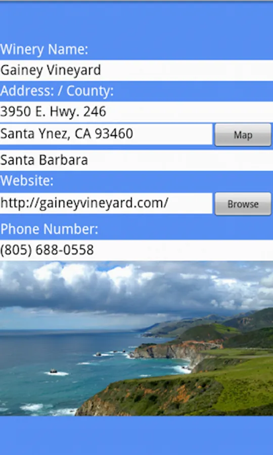 In addition, our application provides a mapping function which uses the selected winery address. The mapping function is very helpful in allowing the user to find any winery in an unfamiliar part of the Central Coast region of California.