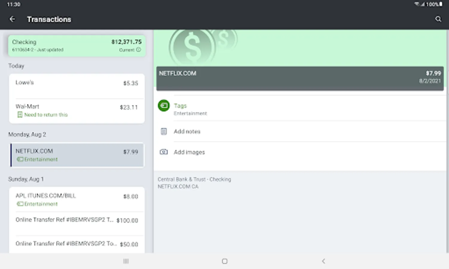 Keep your transactions organized by allowing you to add tags, notes and photos of receipts and checks.