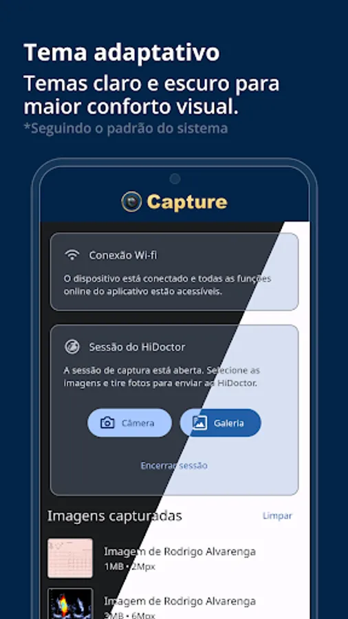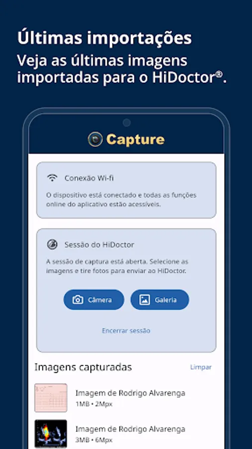 The application makes it possible to transmit images from the camera or gallery of your Android device directly to the computer, archiving them in medical records in HiDoctor®.