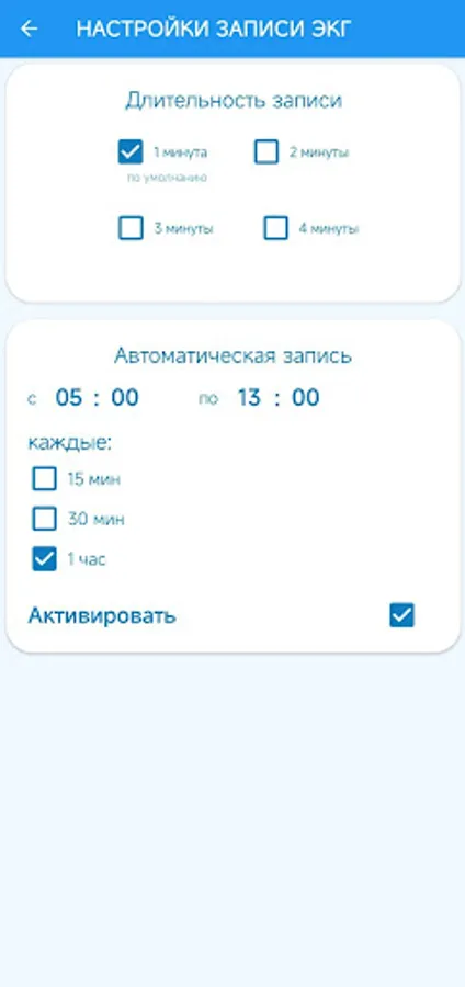 - the possibility of automatic ECG recording with a frequency of 15, 30, 60 minutes.