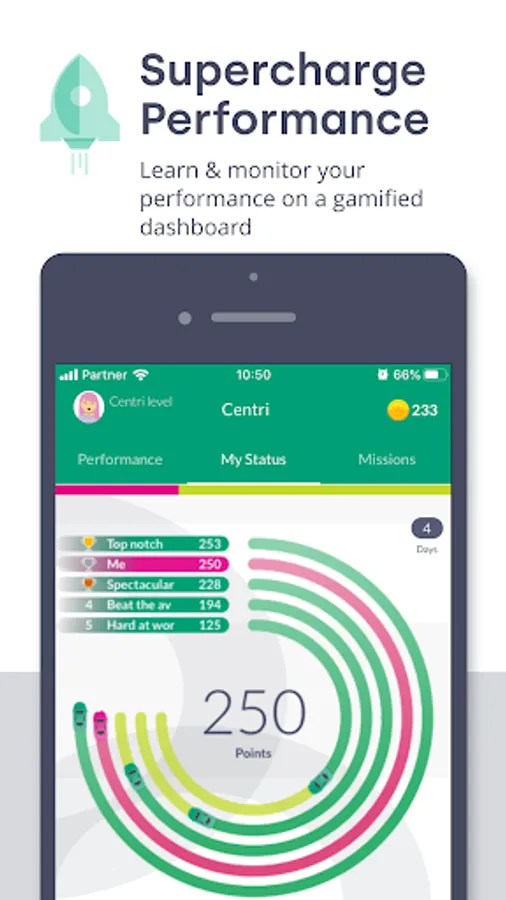 The app shows users, in real-time, how they’re doing and what they need to do next to hit their goals. In addition, it presents challenges and that spur them to compete with peers, across teams or individually on learning activities or goal-specific performance.