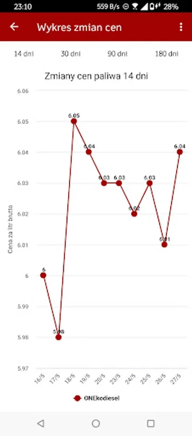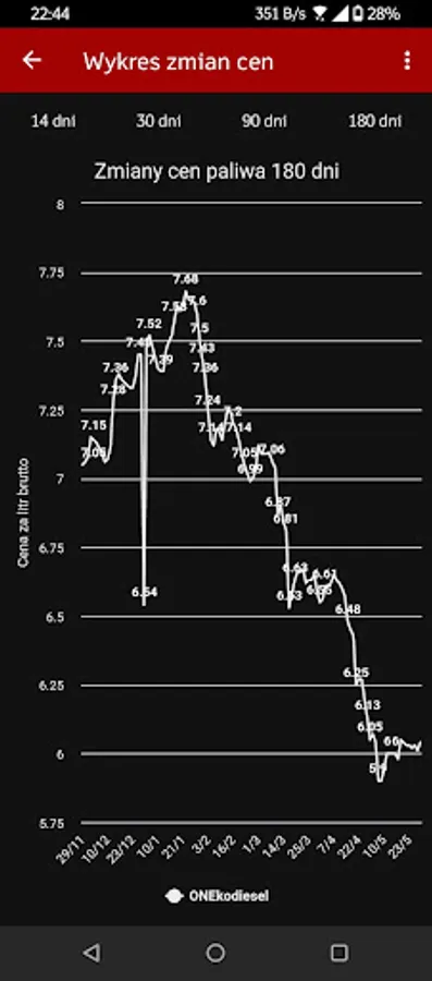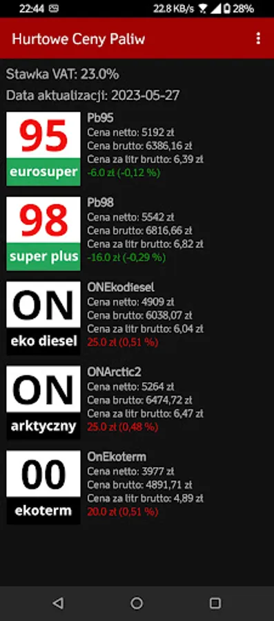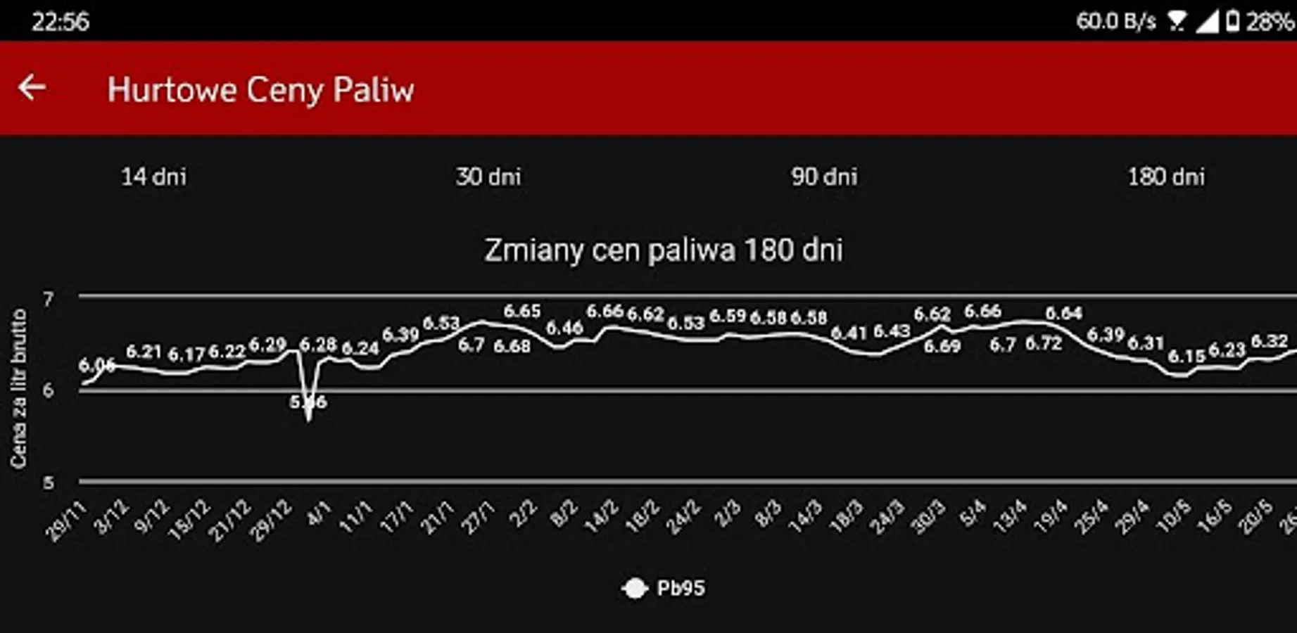 In this application you can quickly check the wholesale prices of PKN Orlen fuels. Prices are also presented per liter gross on clear charts for quick analysis. The application is simple and does not contain any ads.