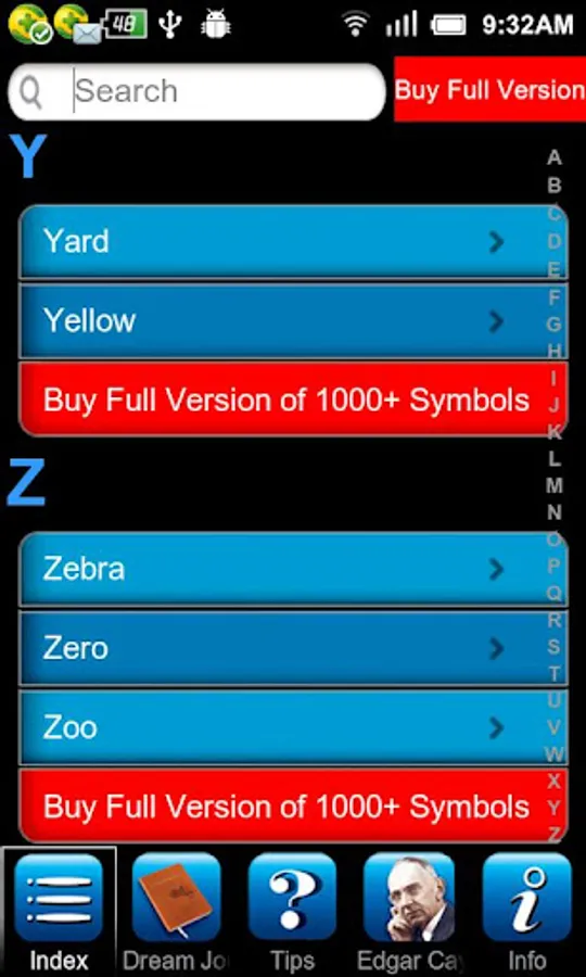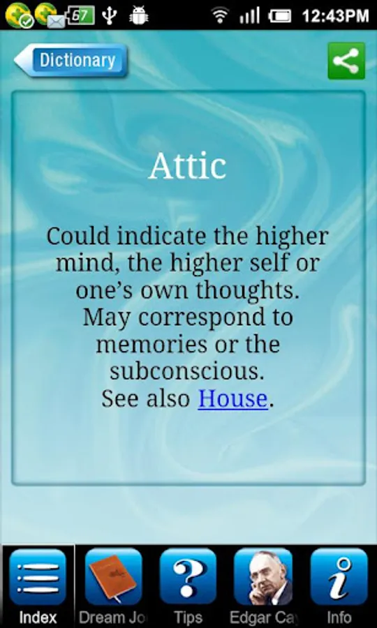 • Index of more than 350 dream symbols (in-app purchase to buy the full 1000+ symbols)