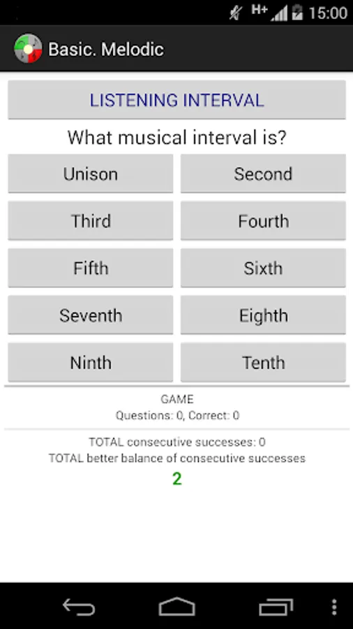 Melodics musical intervals level, contains 210 questions with their respective sounds for the user to practice recognition interval. You can hear the sound more than once before deciding.