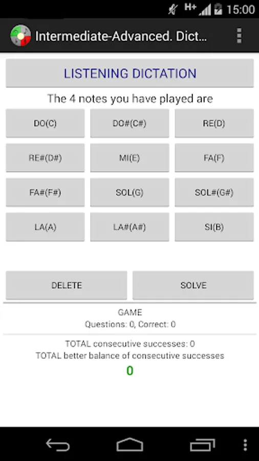 The Musical Dictation intermediate-advanced level contains over 500 compounds from natural sounds musical notes and / or altered. You can also hear the natural sound C reference in the menu at this level.