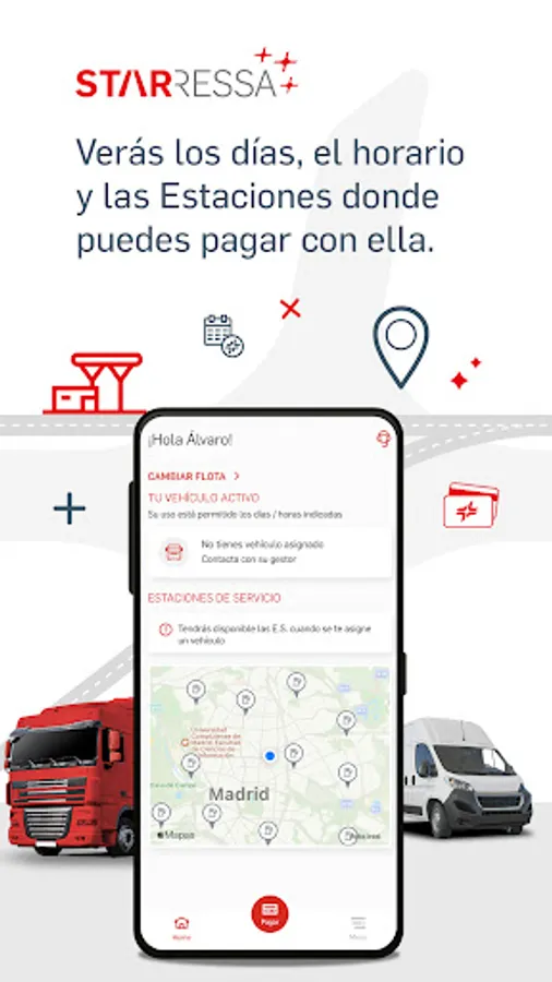 You will only be able to pay with the STARRESSA App for the fuel of the vehicle assigned by your company. In the app you will be able to see the days of the week, the schedule, and the Service Stations where you are authorized to make your payments.