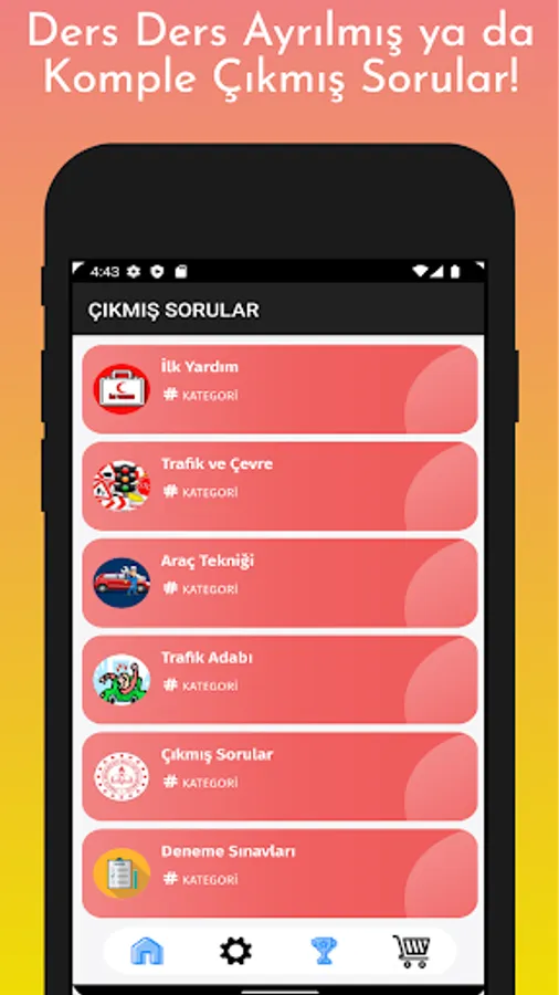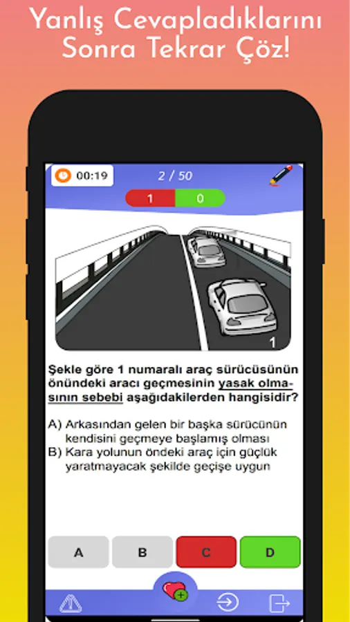 In the mobile license application, you can find all the questions, lecture videos and lecture notes of all the driver's license exams held from 2015 to 2018. By downloading the application now, you can successfully complete the Driver's License Exam Preparation stage and be successful in the electronic e-exam.