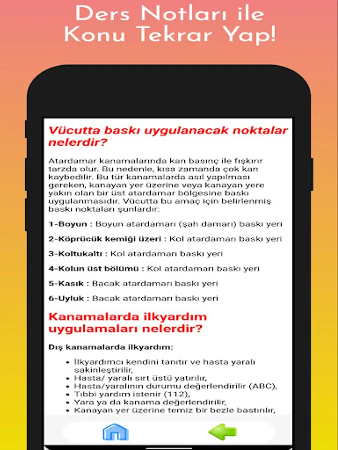 In our application, there are First Aid Exam Questions, Traffic and Environment Exam Questions, Engine and Vehicle Techniques Exam Questions, Traffic Etiquette Exam Questions, questions from the exams held between 2015-2018 and randomly prepared trial exams.