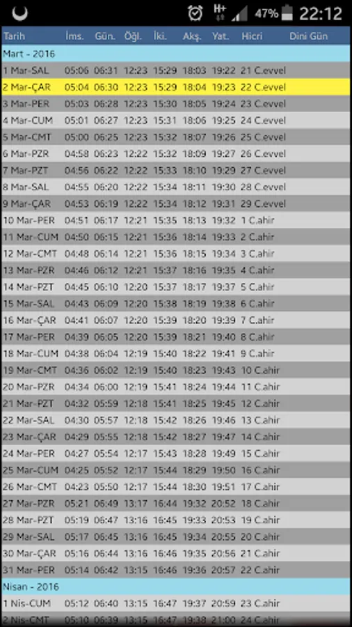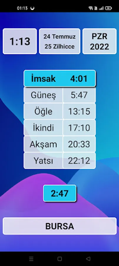 It is an application developed for mobile devices that allows tracking prayer times. The annual measurements of the Presidency of Religious Affairs are included in the program, so the program does not require an internet connection. The application provides a fast usage with a service running in the foreground. In addition, the remaining time and -/+ 4min, which is the caution time of the DIB, are displayed with the notification icon.