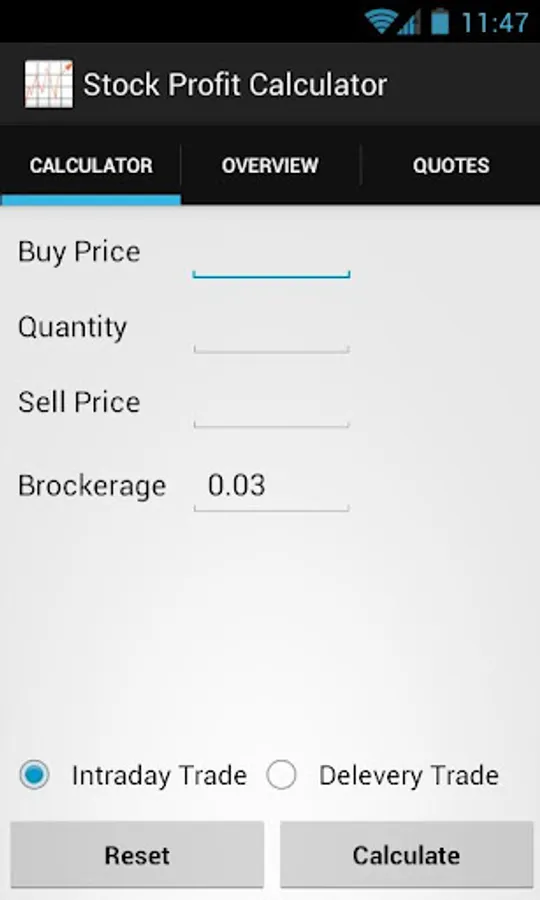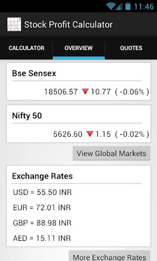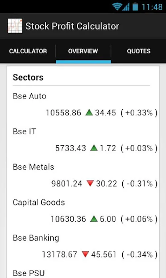 This free application can help to calculate the actual profits realized from a stock trade(a buy sell pair) after tax deductions and brokerage. The stock profit calculator is designed to calculate profits from trades that are executed in INDIAN STOCK EXCHANGES only. This application also features option to fetch status of BSE Sensex, NSE Nifty and some global indices from Asia, Europe, US and currency exchange rates without leaving the application. Sector wise Bse indices are also included.