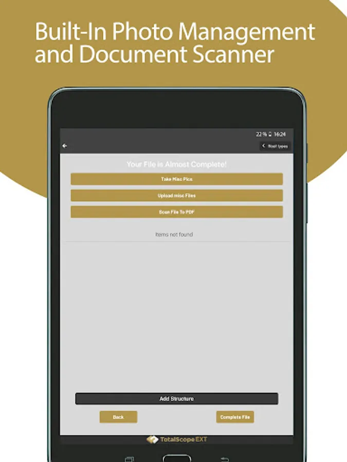 The TotalScope app is for roofing companies that are clients of TotalScope, Inc.. This app is designed for employees of roofing companies that work in the field, allowing a much smoother and more efficient workflow process and getting an improved supplement from TotalScope.