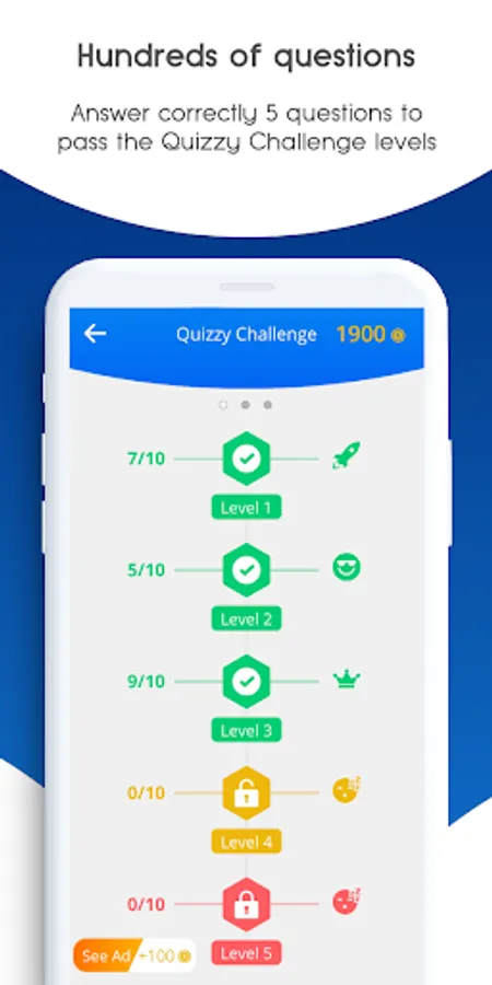 Quizzy Challenge Will you be able to pass all the levels of our Quizzy Challenge? Answer 5 or more questions correctly in each level to pass and unlock the next one. Help yourself with the wildcards (clue, extra time and discard option) to get out of doubts. If you get stuck in any level, we offer you extra questions to get 5 correct answers or the option to buy directly the pass to the next level.