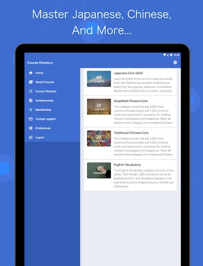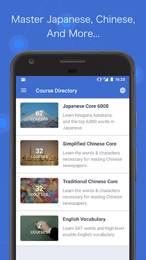 Official courses are offered for studying Japanese, Chinese, and SAT English. The Japanese Core 6000 covers the 6,000 most commonly used words in Japanese, and the Chinese Core 2000 covers the 2,000 most commonly used words in Chinese. All words have sample sentences and audio.