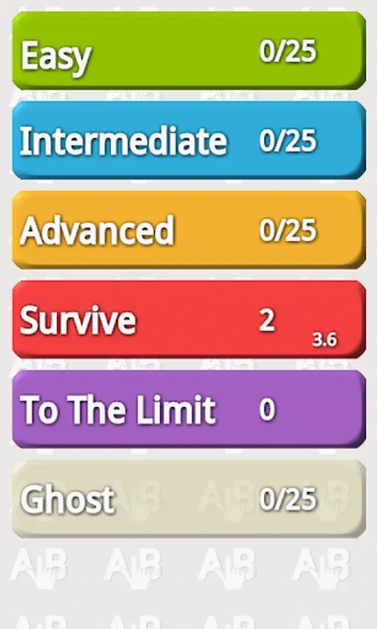 There is a list of the best times for each game mode. In modes Easy, Intermediate, Advanced and Ghost you get time to upload to Ranking when you complete all game levels. Total time is the sum of every level time. In Survive and To The Limit modes times can be uploaded from the first result.