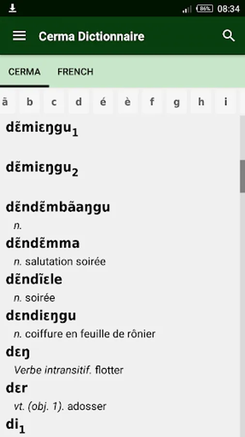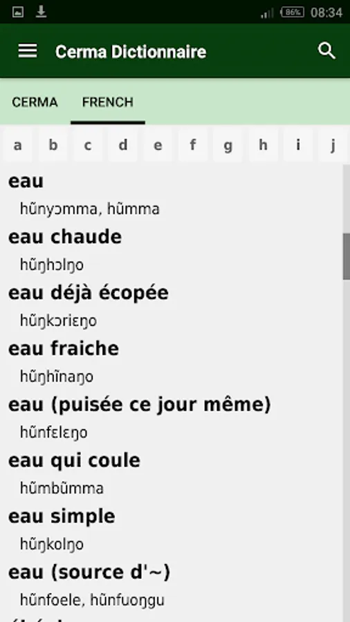 Here is a dictionary app in Cerma, also called Goin, Gouin, Gwe, Gwen, Kirma. The cerma is spoken in Burkina Faso in the south-west around the cities of Niangoloko and Banfora. This app contains more than 5000 entries.