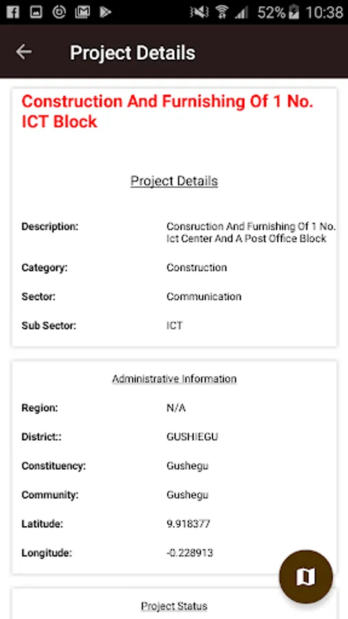 Ghana Districts Infrastructure Mapping App provides real time and credible spatial data on developmental activities within Districts to enhance the monitoring & oversight responsibilities of Parliament of Ghana. The system is currently piloting in 30 districts of Ghana. Also known as Ghana electronic Mapping and Monitoring System (GHeMMS)
