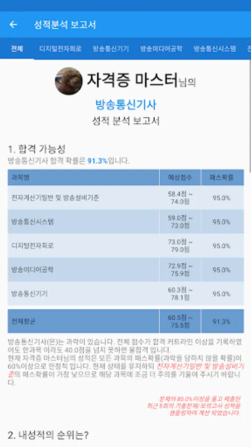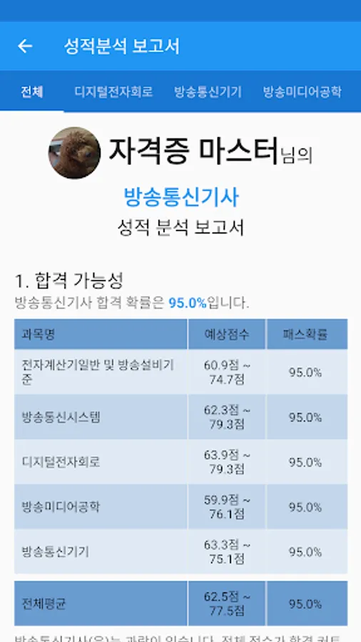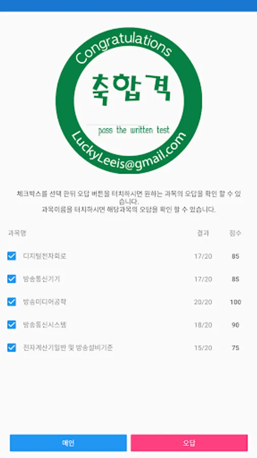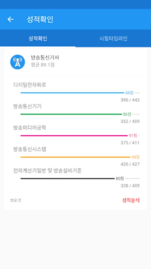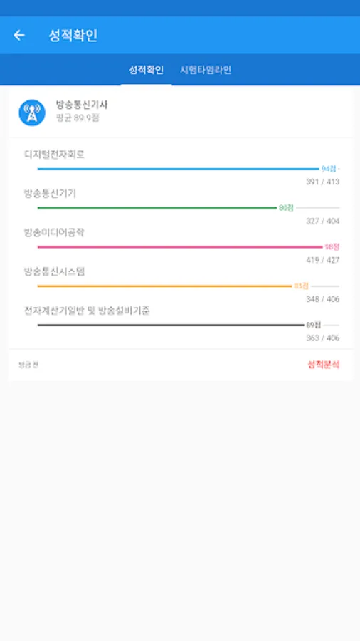 성적확인 - 각 과목별 성적 및 그동안 풀어본 기출문제와 모의고사, 문제풀기의 성적을 볼 수 있습니다.