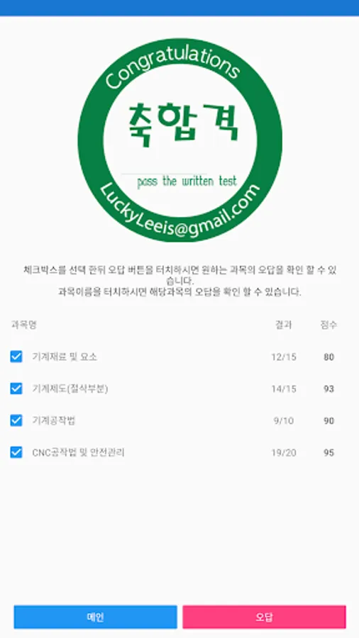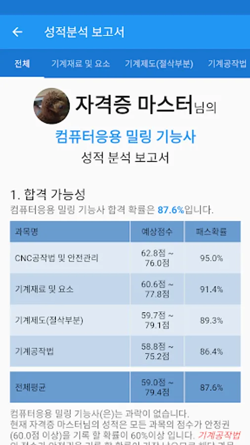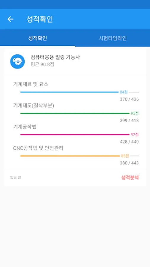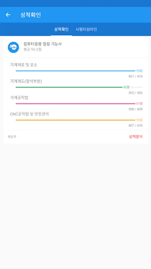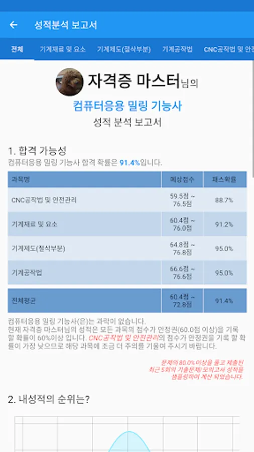 성적확인 - 각 과목별 성적 및 그동안 풀어본 기출문제와 모의고사, 문제풀기의 성적을 볼 수 있습니다.