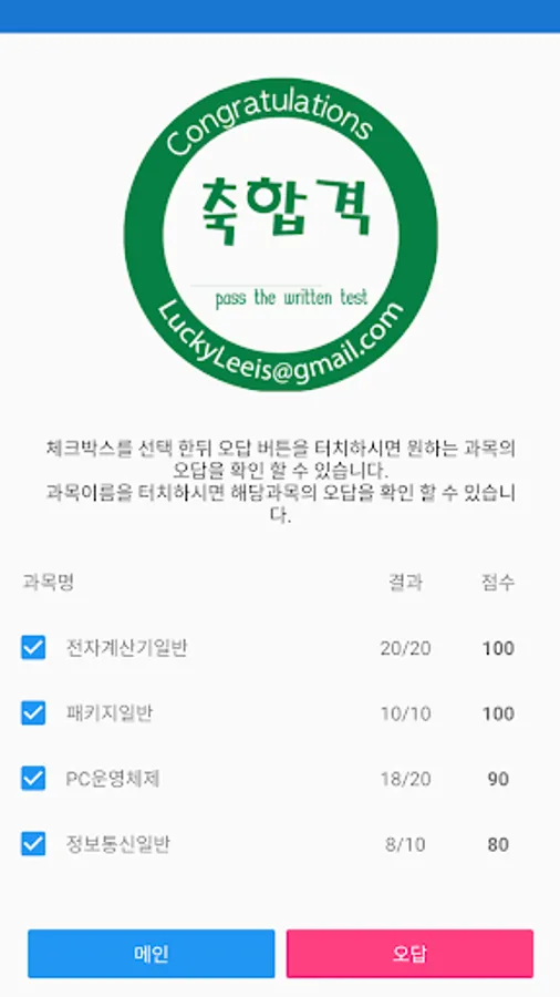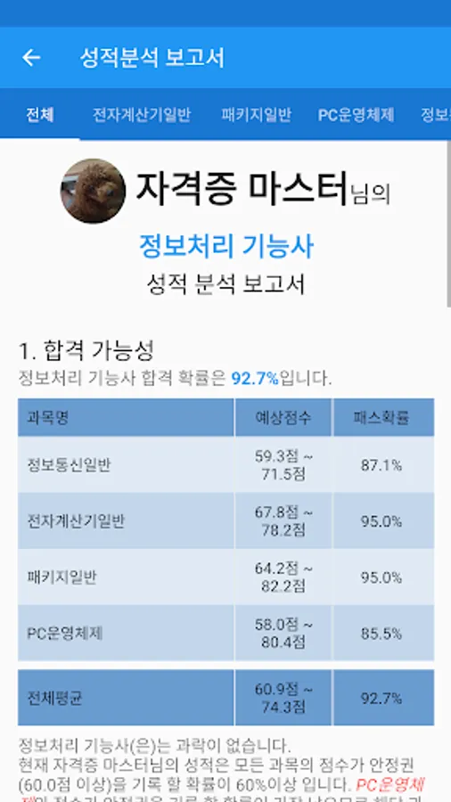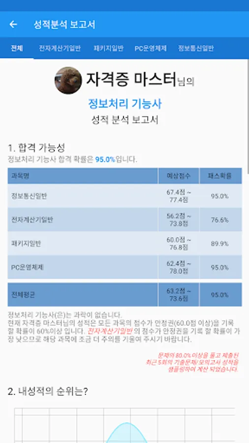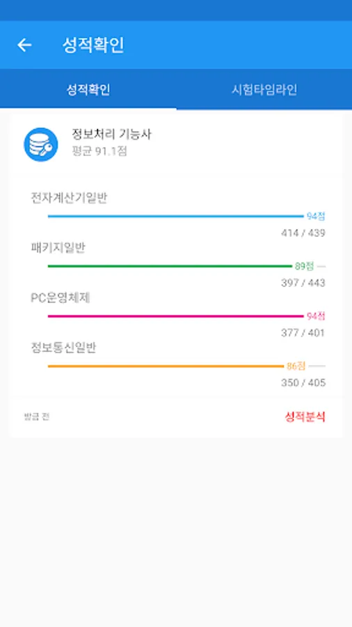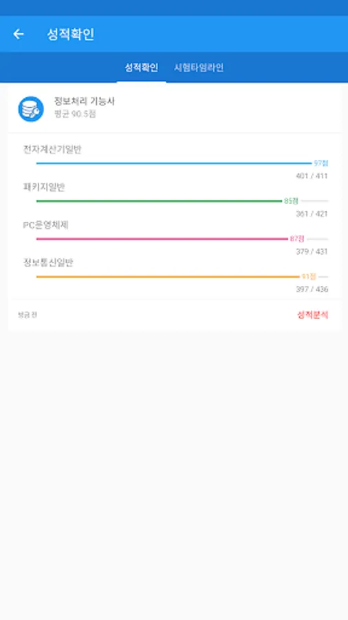 성적확인 - 각 과목별 성적 및 그동안 풀어본 기출문제와 모의고사, 문제풀기의 성적을 볼 수 있습니다.