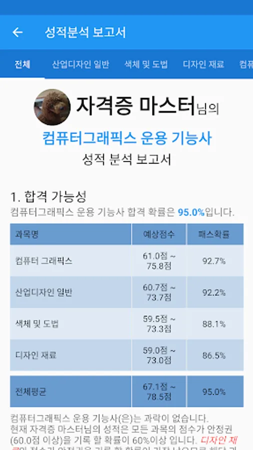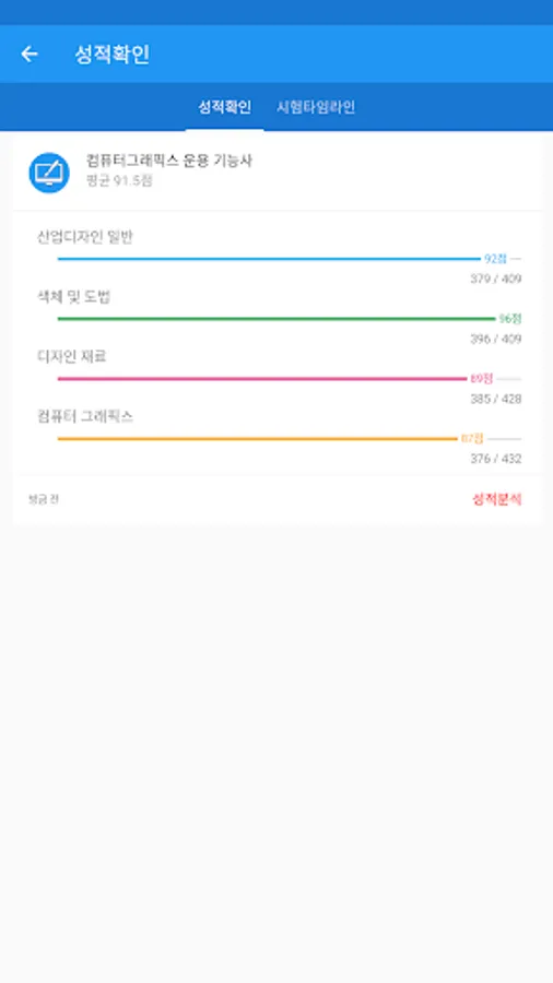 성적확인 - 각 과목별 성적 및 그동안 풀어본 기출문제와 모의고사, 문제풀기의 성적을 볼 수 있습니다.
