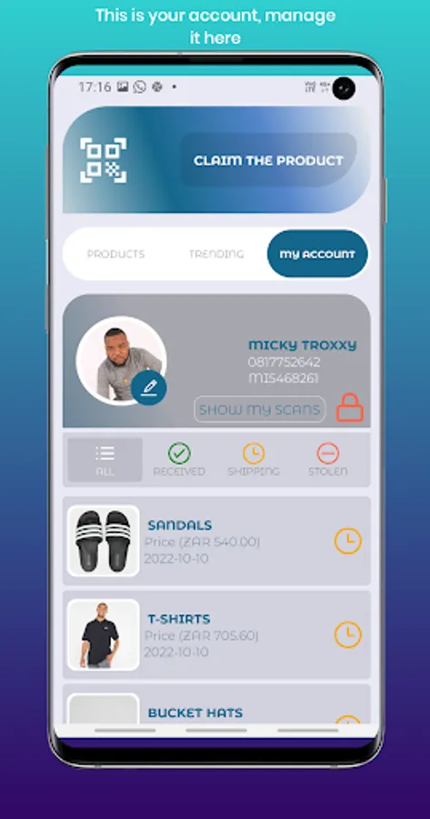 On the customer app, once the customer purchases a valid item from the store or online, he / she can scan the product, the system then checks if the item already has an owner or not. If it does not, then they can claim the product to be under their name. Now the customer may feel a sense of ownership, no one can say he / she is wearing a fake product since the product can be scanned. After scanning a claimed product, we show you the owner's photo, name, purchase price, address if turned on, product photo, brand name.