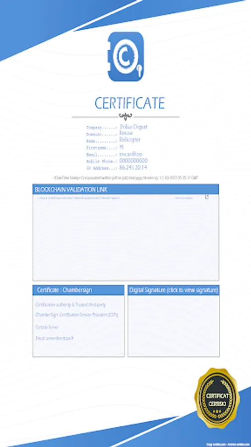With Certisio, get a certification of photographies safely taken on your APP and sent to the blockchain ledger. The PDF Certificate contents all informations (source of data, video, blockchain transaction, binary files, GPS location and instruction for checking reccords) needed to build a prima facie evidence