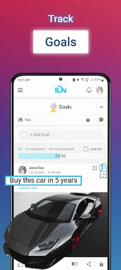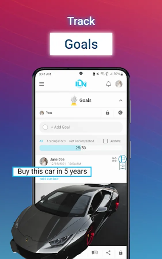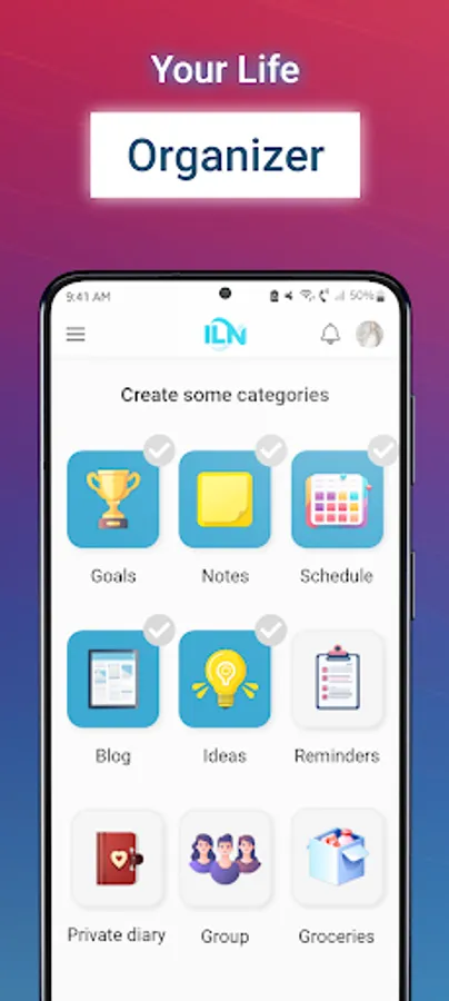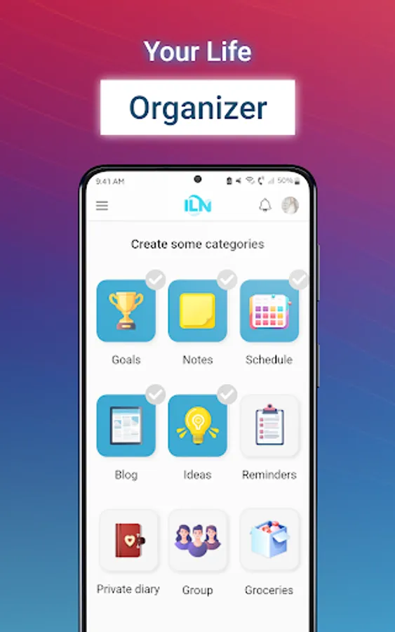 Organize your life and boost your productivity with the ability to store any type of file in ILN’s cloud storage. Attach photos, videos, PDFs, and documents to goals, tasks, diaries, notes, and ideas to keep everything organized and accessible. Get 25 GB of FREE file storage and expand as needed with a PRO account.