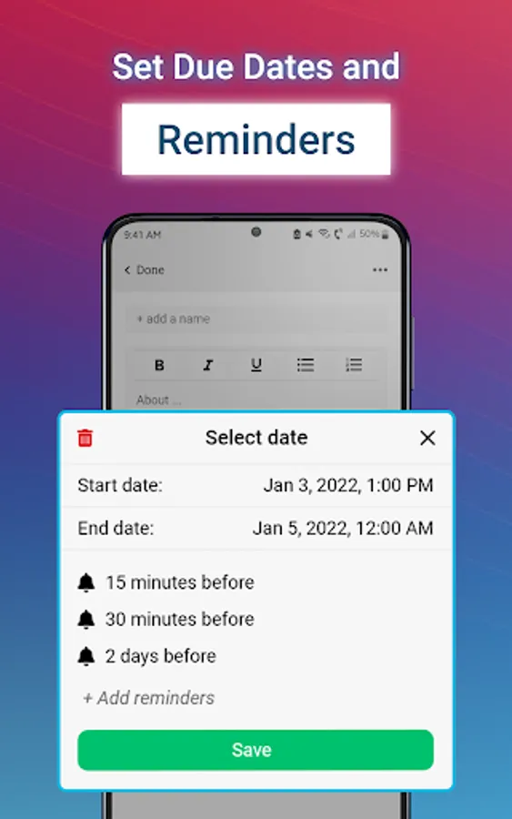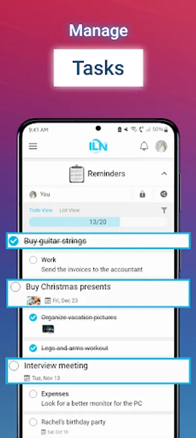 Your task manager helps you get ahead and stay on top of your to-do list. Create task lists, add due dates and reminders, comment on tasks, and track progress. You can also share tasks with your friends and complete them together, making it easy for your group to stay organized and productive!
