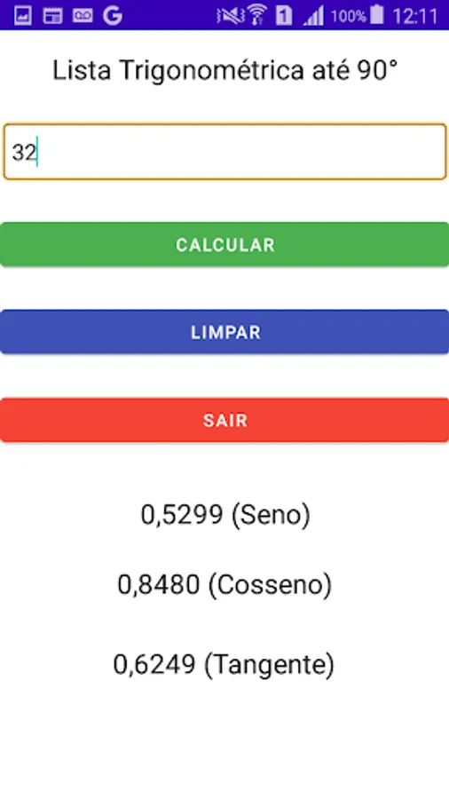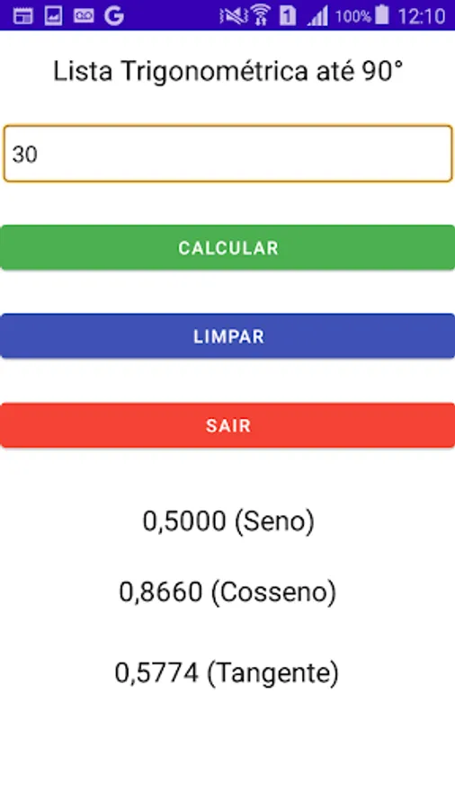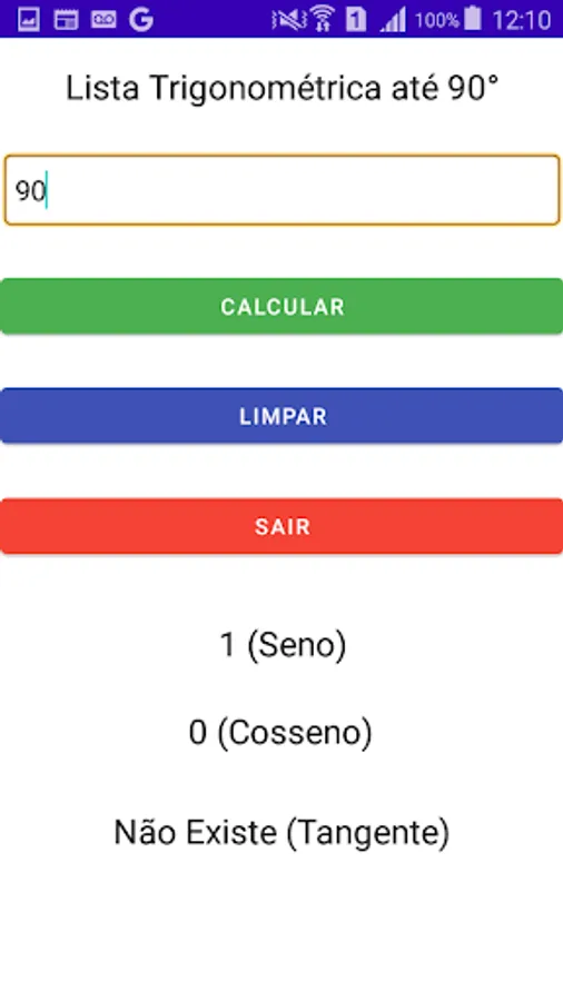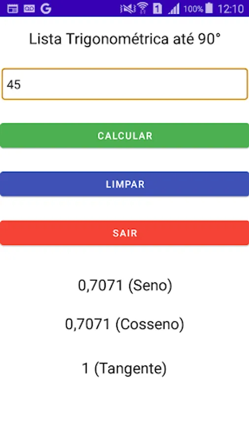 The application consists of the user entering the angle in degrees in Trigonometry and getting the result in Sine, Cosine and Tangent at the same time.