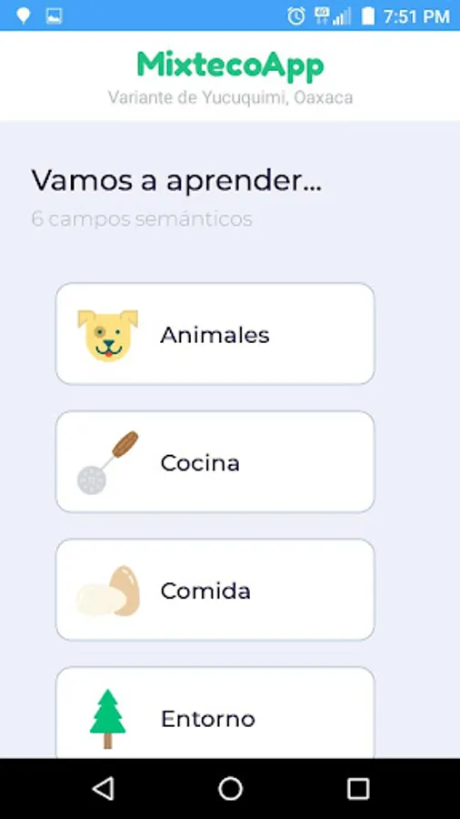 MixtecoApp is a dictionary developed by Fantre, presented in semantic fields; animals, cooking, food, environment, fruits and vegetables, related to the context of the Mixtec culture.