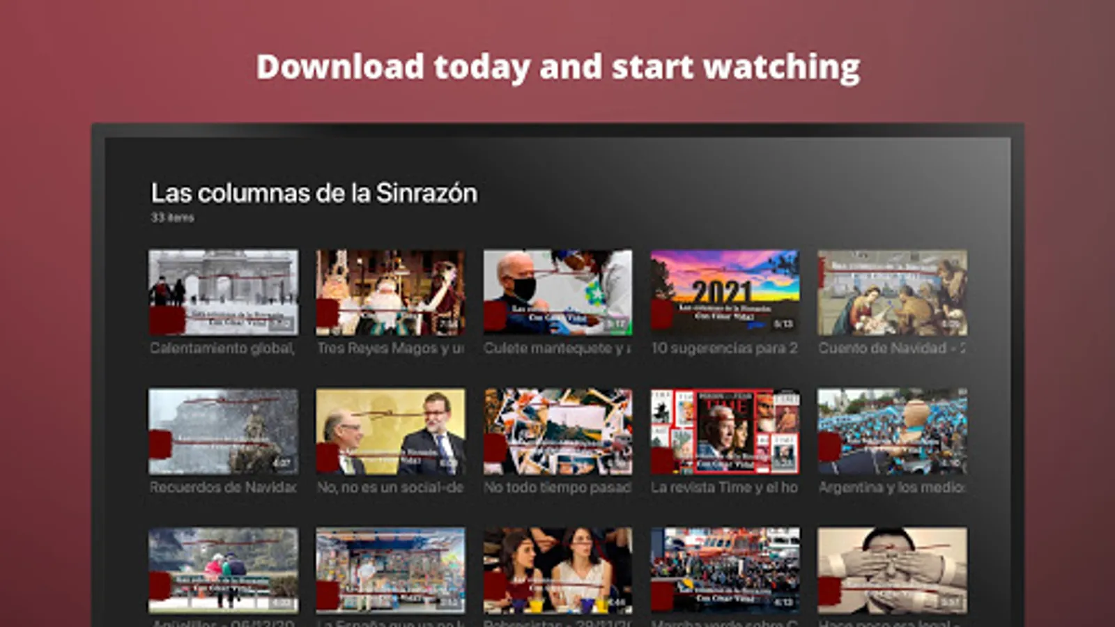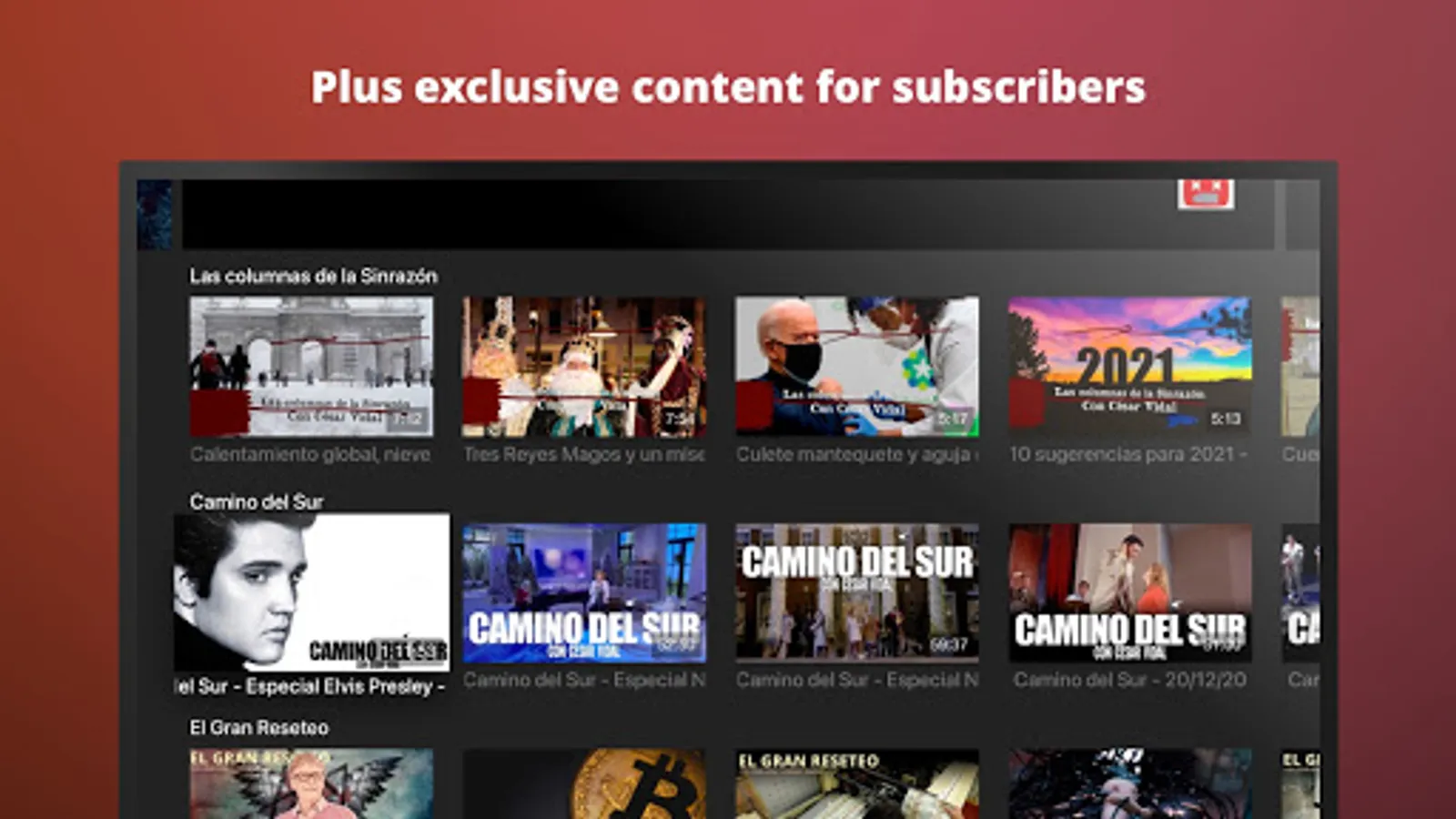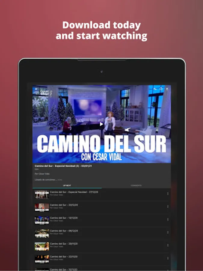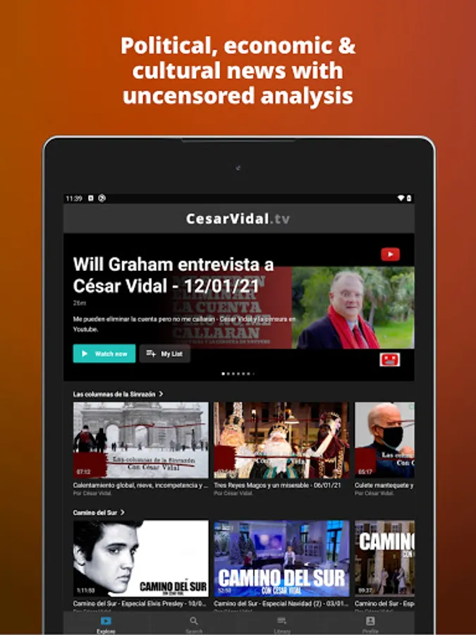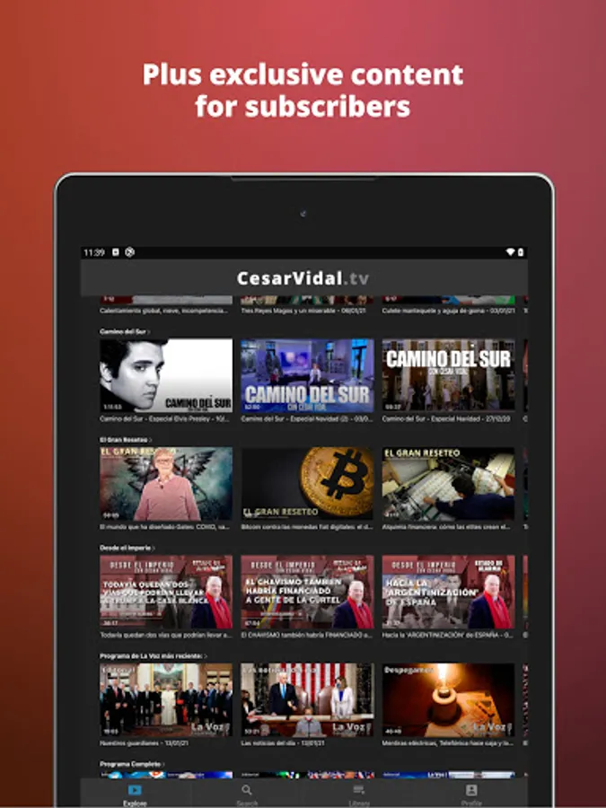 To access all features and content you can subscribe to César Vidal TV on a monthly or yearly basis with an auto-renewing subscription right inside the app.* Pricing can vary by region and will be confirmed before purchase in the app. In app subscriptions will automatically renew at the end of their cycle.