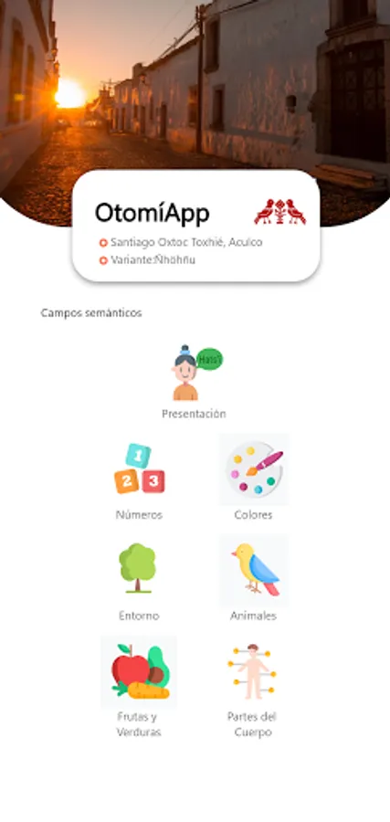OtomiApp is a dictionary developed by Fantre, presented in semantic fields; presentation, animals, numbers, colors, body, environment, fruits and vegetables, related to the Otomi context. The app is thought and designed from a teaching-learning point of a second language, in this case the Otomí language.