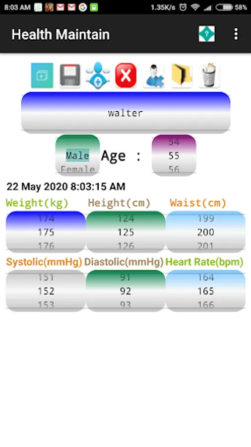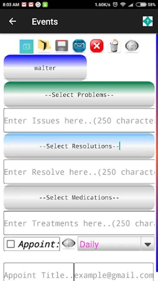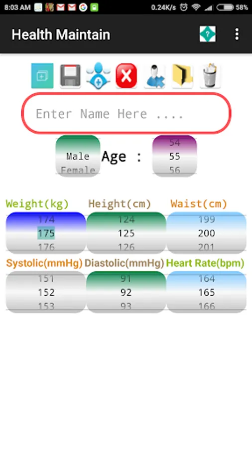 sections to write the persons illness, resolution and medications. Events can be reused for different people, deleted, exported and emailed. Reminders, calendar events can also be added at the same time. When the App starts, if no existing person is found, enter your name a details to get started. Upon starting the last reading details of the initial person will be displayed. Use the dropdown box to select the last details of the selected person. A new reading can be recorded by clicking the Add New Record button. Enter the details via the dialing wheels, click the Save button to save the record. Click the Add New User button to add a new person and details,