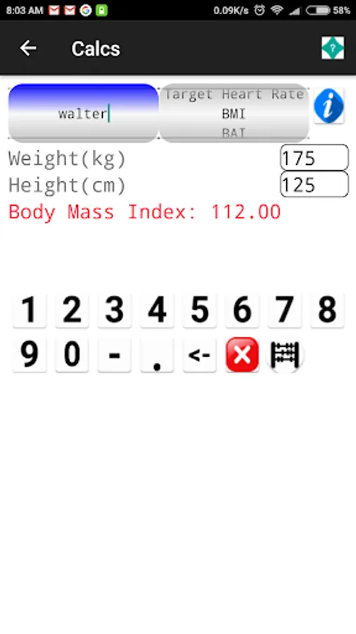 always click the Save button to save the details. Click the cancel button to stop entering a new record. Click the Delete User button to delete the user and their data from the App. Click the Delete record to delete the currently displayed record of the selected user. To display, export and email all readings go to the History menu option. In the History screen select the user and all their data will be displayed below. Click the graphs button to display a graph of the last 20 readings of the selected user. Click the export button to create a csv file of all the data selected persons data. Click the email button to send the export file via the selected method. The settings menu options enables default limit readings to be entered.