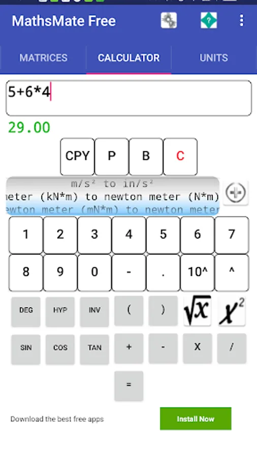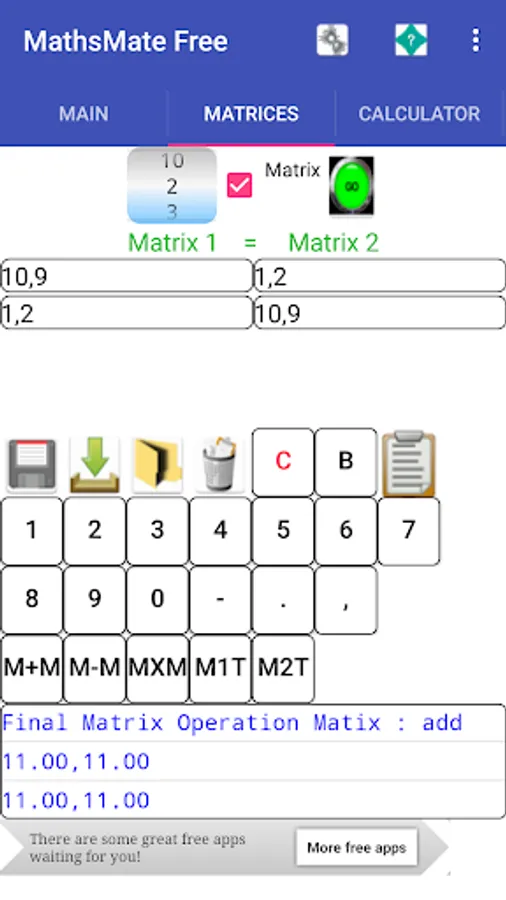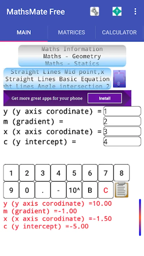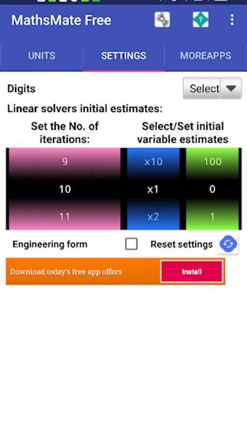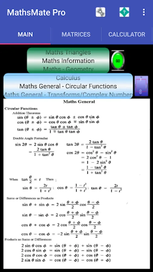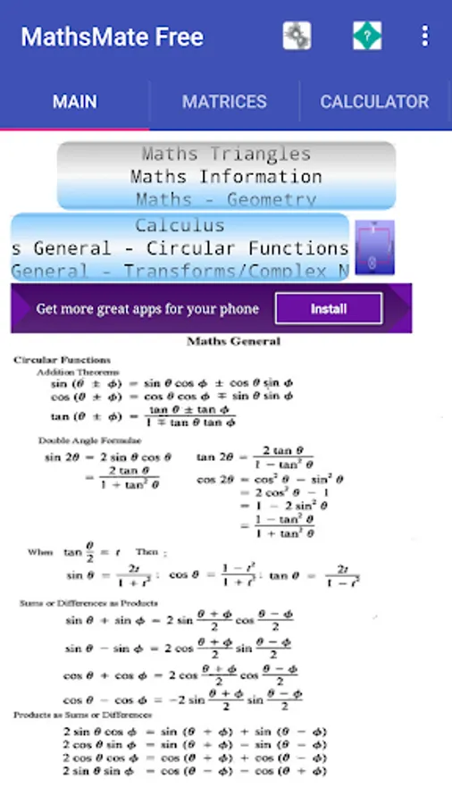 MathsMate Information Plus Solvers Free provides general mathematical information sheets plus a range of equations solvers/calculations in the maths fields of Geometry, Statics,Series,Proportional Lengths,Interest,Areas and Volumes. Also operations between square matrices can be performed (multiply,Addition,Subtraction, Transpose) as well as Linear Equations solving using the Jacobi Interation method.General settings can be made for the program and for the Jacobi Interation method. The App is easy to use with a tab/swipe layout design. The About/Help tab offers a simple web browser. For the linear solvers using the Jacobi method requires setting the initial variable estimates and the number of interations. On display of the results a Error value is also displayed next to the variable value. The error is the difference between the displayed and previous variable value. Generally the smaller the error value the more accurate is the result. Matrices can be saved, emailed, downloaded to file and reopened.
