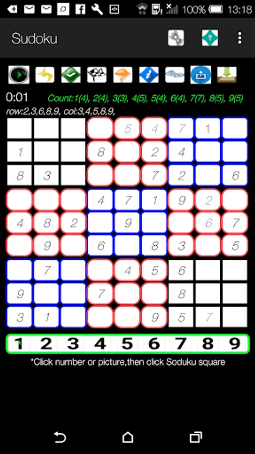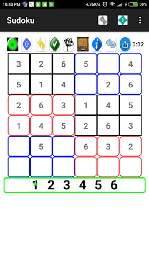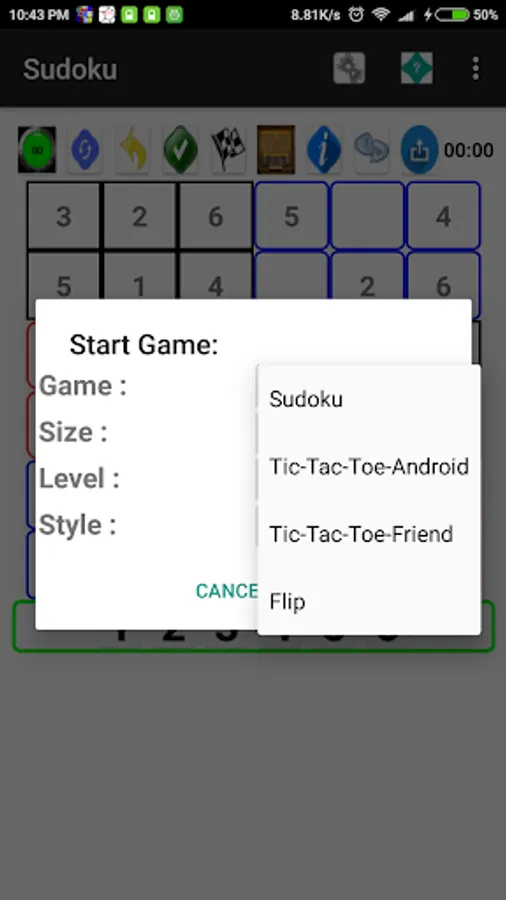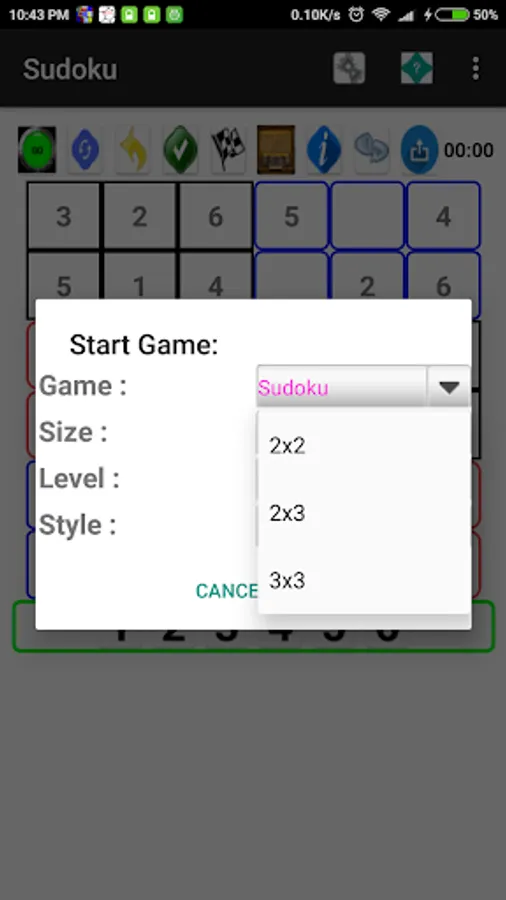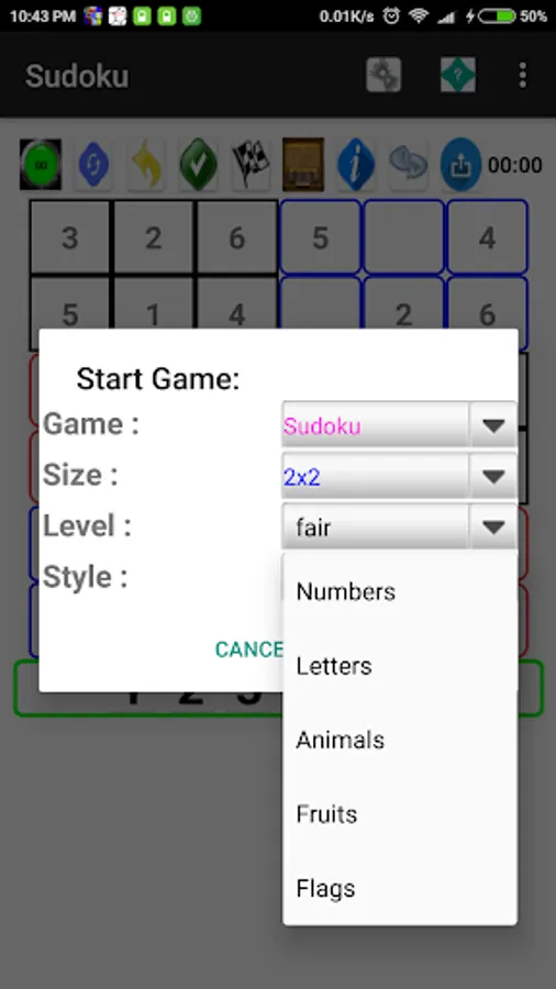 Sudoku App offers a range of game levels, different square size puzzles (2x2, 2x3, 3x3), use numbers or letter or flags games, standard controls for the game.