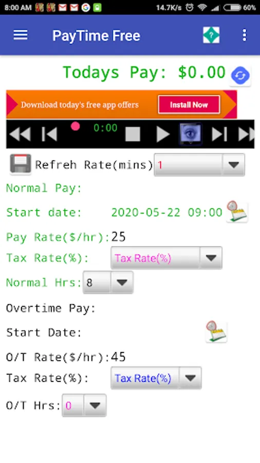 PayTime an app to cheer you up when your working! Calculates your hour pay per minute and displays your pay. Knowing what you make improves your day.While you are watching your pay increase listen to an online radio station or play your music files or generate your winning lotto numbers or play one of the many flipper games i.e. Coin.... all in the one app while you watch your pay increase! Makes working a breeze.