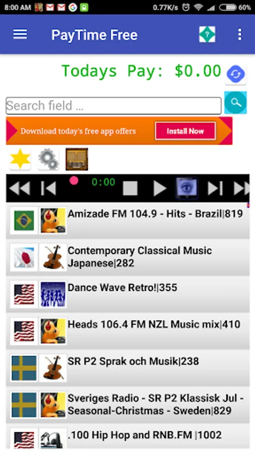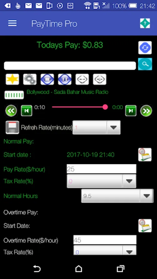 PayTime enables to set hourly pay rates (normal and overtime), dates to start calculating your pay, set hour time frames for each pay limit. Dates will be automatically adjusted for each day. Displays are set on screen and also screen notifications are set per refresh rate setting. Over 200 worldwide radio stations included, a random number generator to create those winning lotto numbers and a flipper game to decide who's shout it is, pays for dinner, who wins the game etc.