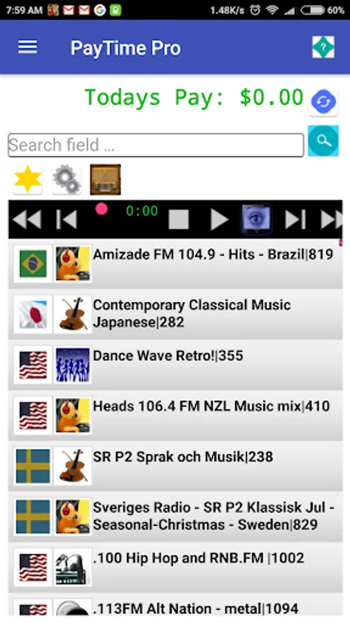 PayTime enables to set hourly pay rates (normal and overtime), dates to start calculating your pay, set hour time frames for each pay limit. Dates will be automatically adjusted for each day. Displays are set on screen and also screen notifications are set per refresh rate setting. Over 200 worldwide radio stations included, a random number generator to create those winning lotto numbers and a flipper game to decide who's shout it is, pays for dinner, who wins the game etc.