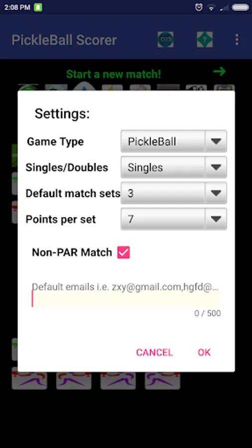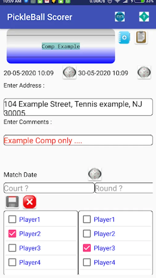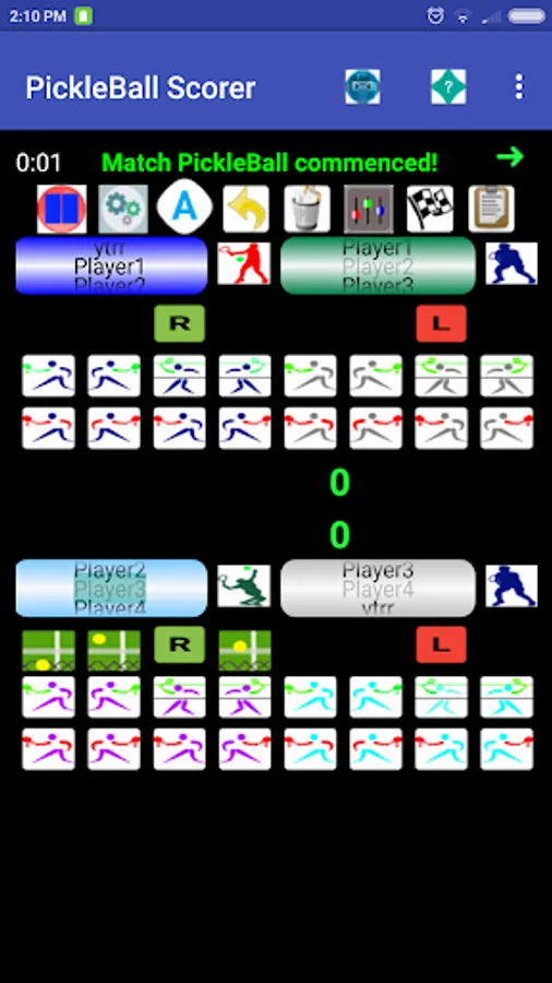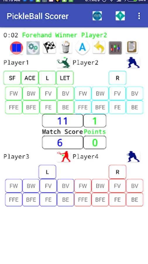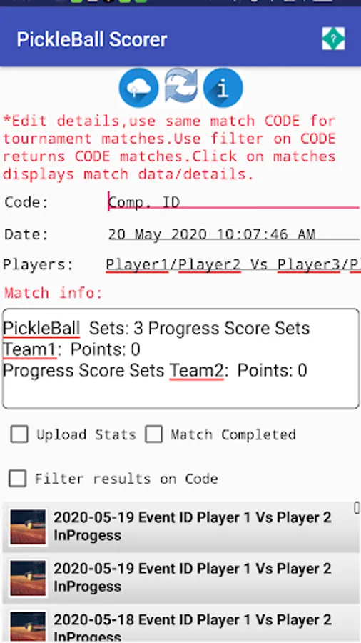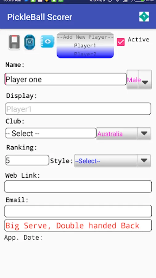 The settings screen allows for the selection of default match sets. In the players screen user defined players can be added, along with their details i.e. club, country, right handed play, comments about each player etc Appointments and details of each player can be created and sent to required people. The standard scoring system applies. List of players data/stats which can be stored during play and later displayed/reviewed. Competitions can be setup.