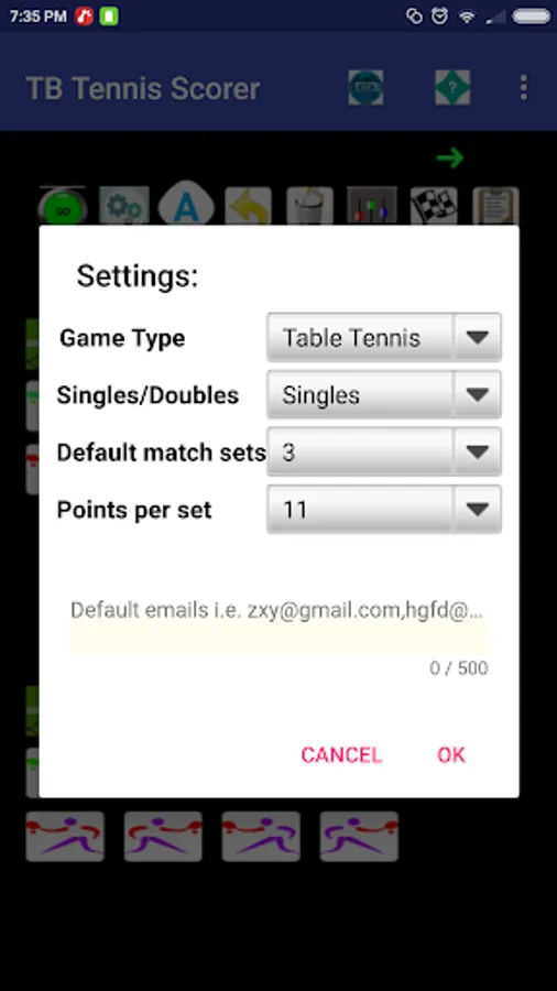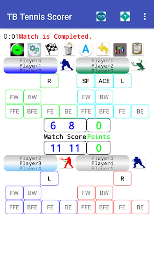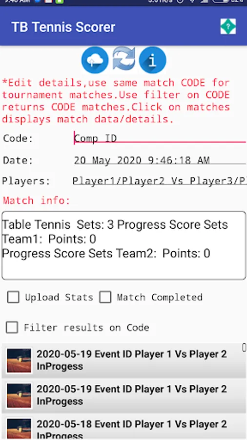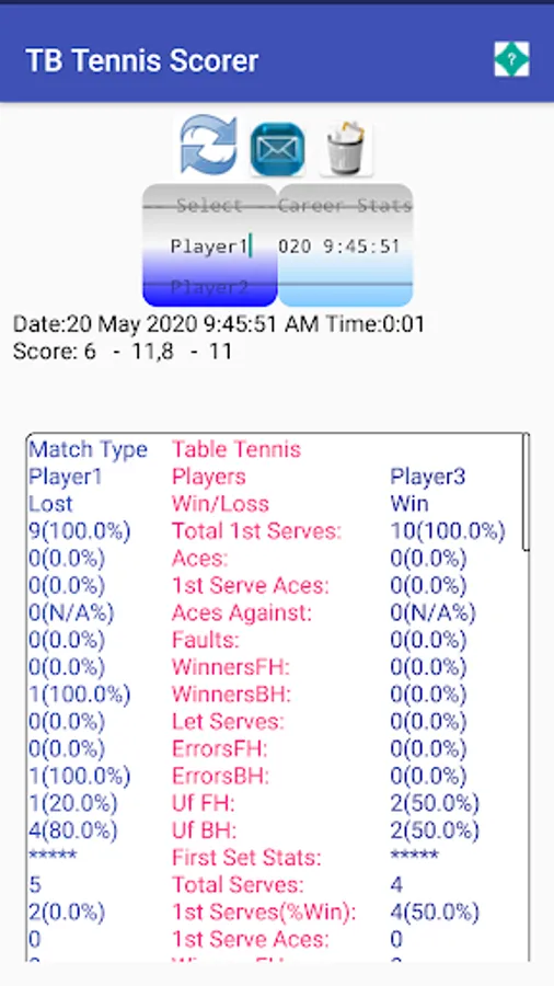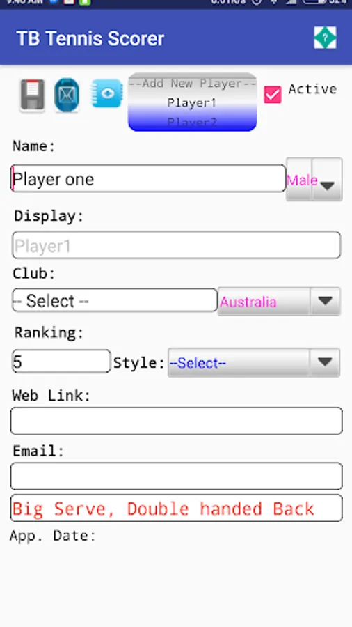 Match comments can be created, export and emailing of match progress stats and comments. The match stats can be viewed once the match has completed in the stats viewer screen and also the inplay stats can be saved and emailed during play. The app allows for both singles and doubles play, will automatically set the adjust servers and receivers after games, sets, tie breakers(You can manually change the server and receiver by clicking the players serve button. The settings screen allows for the selection of default match sets. In the players screen user defined players can be added, along with their details i.e. club, country,right handed play, comments about each player etc Appointments and details of each player can be created and sent to required people.