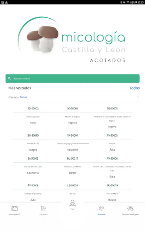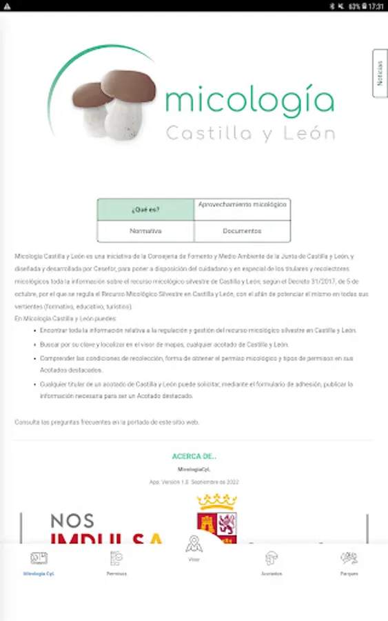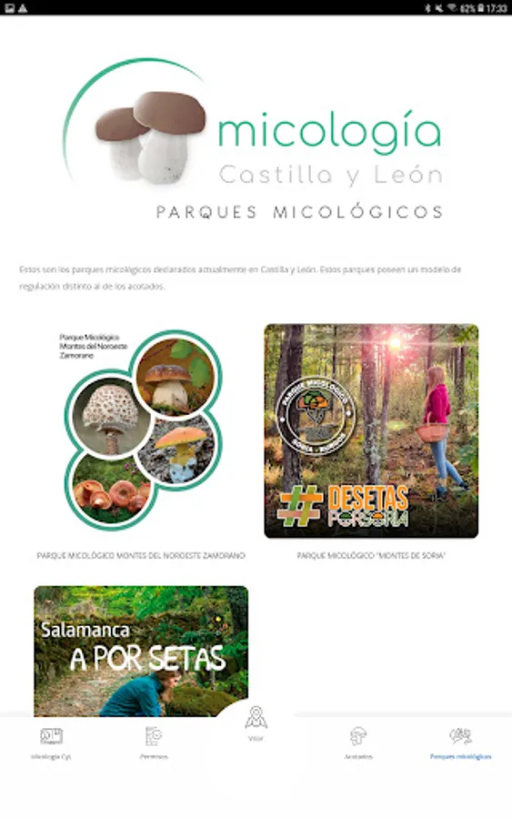 Mycology CyL is a mobile APP linked to the web portal 'micologiacyl.es', which offers the information available on all the existing mushroom and mycological parks in the Autonomous Community of Castilla y León, so that the end user has The complete offer of spaces under mycological regulation is available to you, providing the possibility of obtaining the permit linked to each regulated area (in those in which it is possible), as well as accessing the different rates referred to each of these spaces.